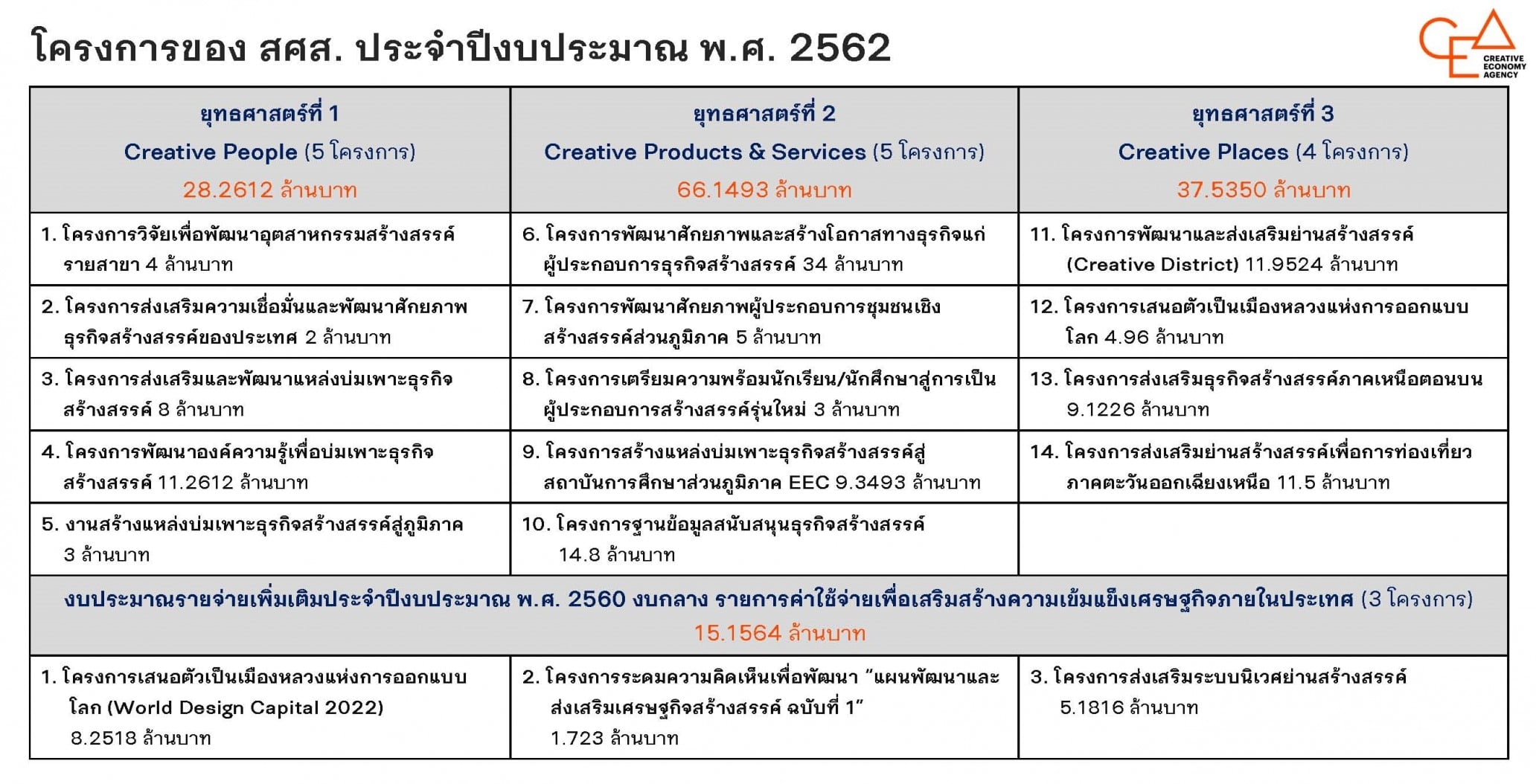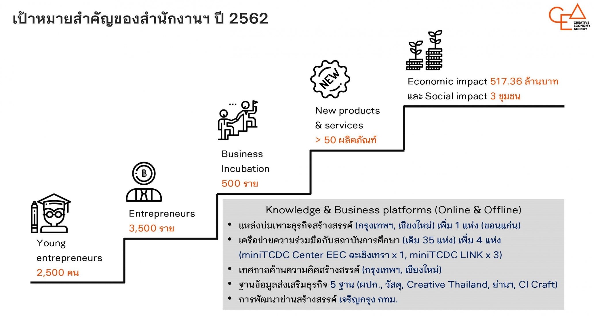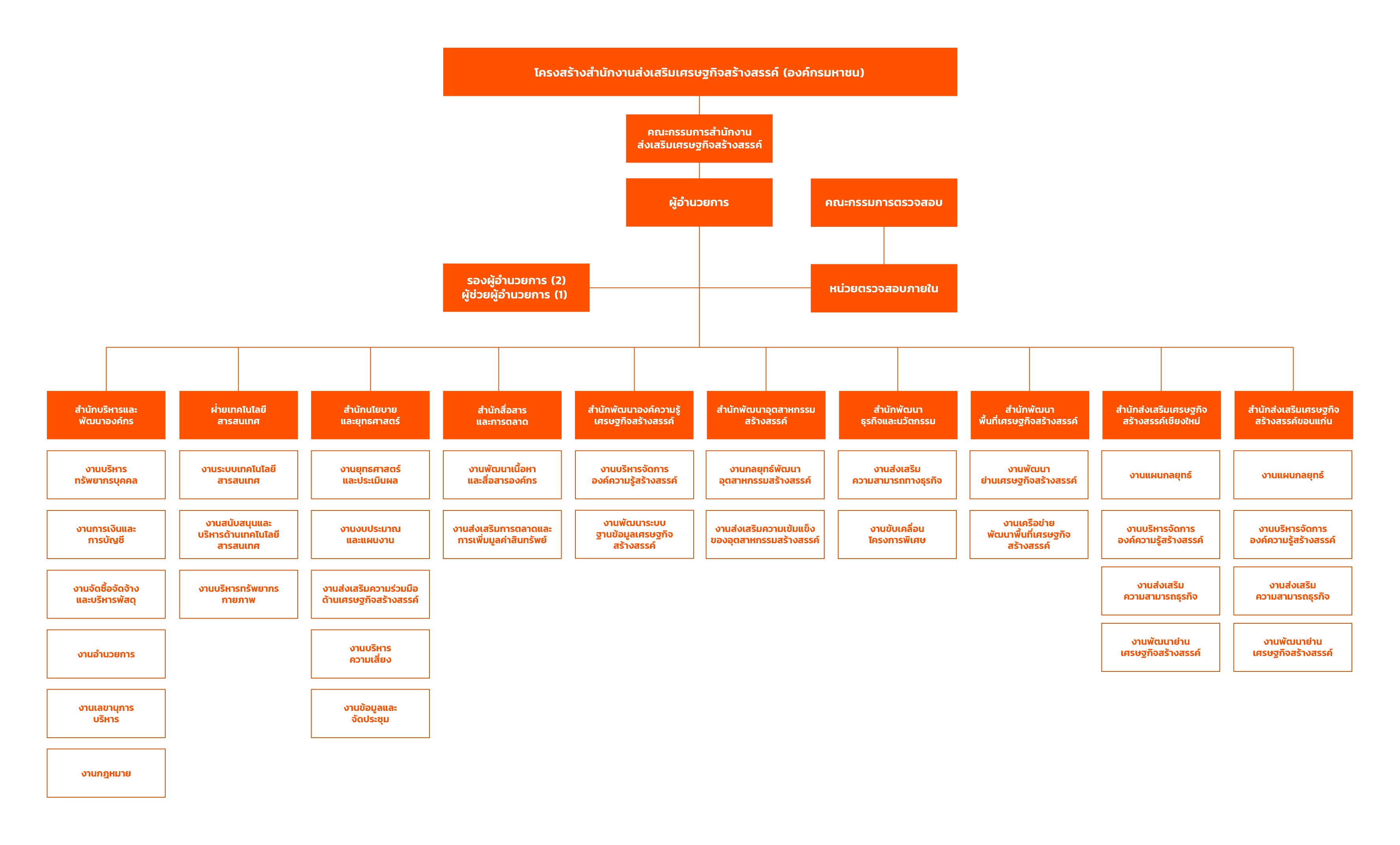 จัดตั้งสำนักงานส่งเสริมเศรษฐกิจสร้างสรรค์ขึ้นเป็นองค์การมหาชน ทำหน้าที่ส่งเสริมและพัฒนาศักยภาพของเศรษฐกิจสร้างสรรค์ เพื่อให้เศรษฐกิจสร้างสรรค์เป็นพลังขับเคลื่อนไปสู่เศรษฐกิจที่สมดุลและยั่งยืนในระยะยาว